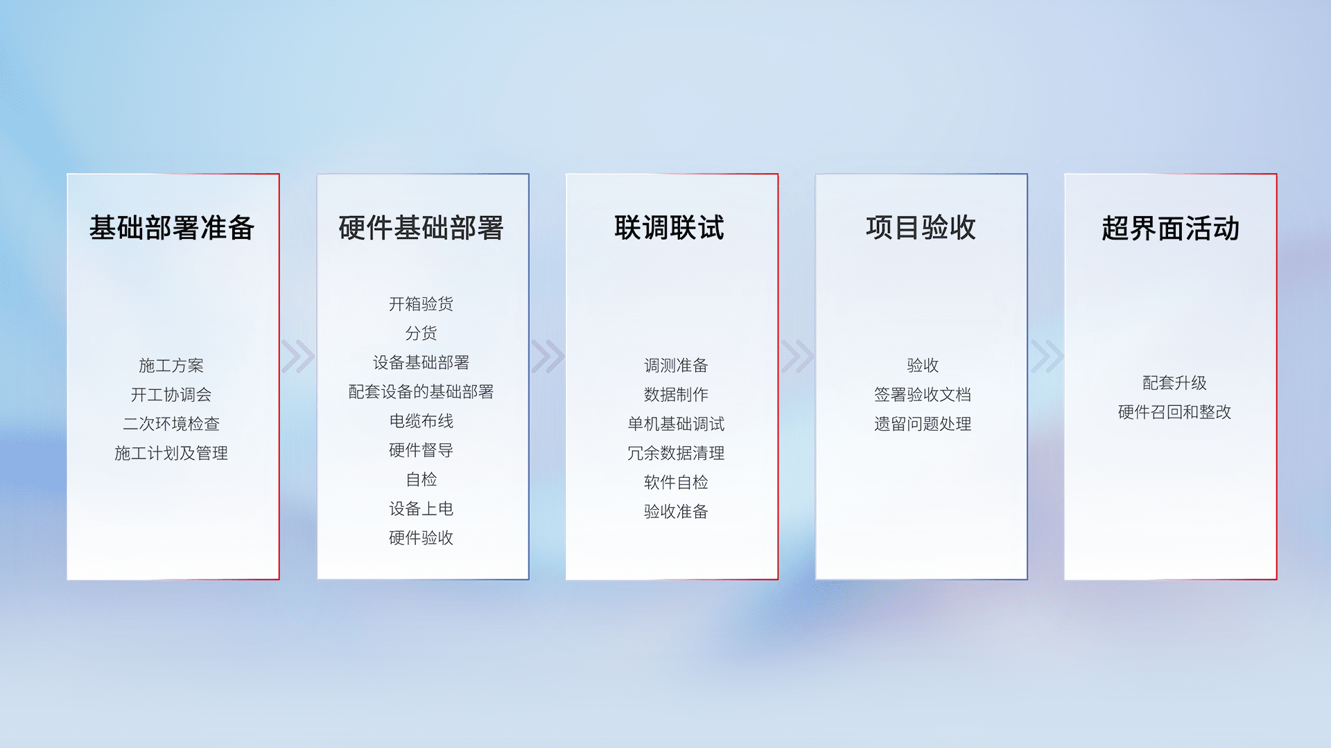 从基础部署准备、、、、硬件基础部署、、、联调联试、、项目验收、、越界面活动的全过程可追溯,,,保证施工质量和进度。。